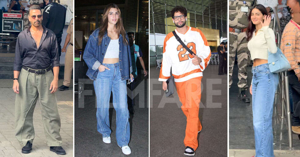 Ananya Panday stored it informal but fashionable in a white long-sleeved cropped prime with a zip-up collar, paired with high-waisted, wide-leg, light-wash denim denims. She added a pop of color with crimson footwear and carried a lightweight blue shoulder bag for a relaxed journey vibe. Akshay Kumar opted for an effortlessly cool look in an outsized black collared shirt with an open neckline, paired with olive-green pleated trousers. A black belt, matching footwear, and smooth sun shades accomplished his understated, stylish outfit.