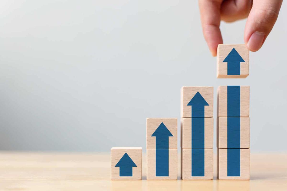 Ladder career path for business growth success process concept.Hand arranging wood block stacking as step stair with arrow up
